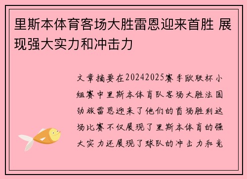 在2024-2025赛季欧联杯小组赛中,里斯本体育队客场大胜法国劲旅雷恩,迎来了他们的首场胜利。这场比赛不仅展现了里斯本体育的强大实力,还展现了球队的冲击力和竞技水平。球队在客场的表现堪称完美,从进攻到防守,每个环节都发挥得淋漓尽致。雷恩作为法国足球的传统强队,本赛季状态较好,但在与里斯本体育的较量中显得毫无还手之力。本文将从四个方面对这场比赛进行详细分析,分别探讨里斯本体育的实力体现、战术安排、球员表现以及比赛中的关键时刻。这场胜利标志着里斯本体育在本赛季的崛起,也为球队接下来的比赛注入了强大的信心和动力。