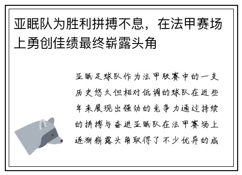 文章摘要的内容:亚泰队的主教练岌岌可危,其战绩低迷引发了下课风波。本文从战绩分析、团队管理、球员情况和外界压力四个方面深入探讨了这一问题,揭示了背后的复杂因素和影响。