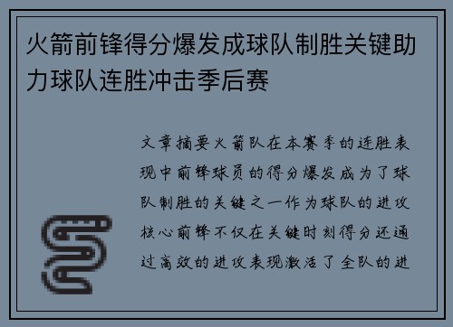 通过分析火箭前锋的得分爆发对球队连胜的重要作用,可以看出,他不仅在进攻端提供了必要的火力支持,还在关键时刻通过得分帮助球队稳住局面。前锋的爆发力让火箭队的进攻体系变得更加立体,成为了球队能够连胜的关键因素之一。