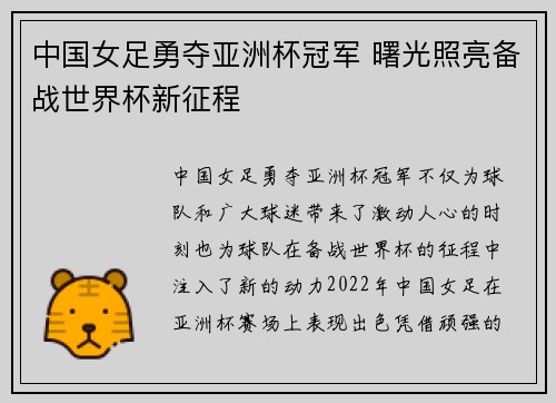 中国女足勇夺亚洲杯冠军,不仅为球队和广大球迷带来了激动人心的时刻,也为球队在备战世界杯的征程中注入了新的动力。2022年,中国女足在亚洲杯赛场上表现出色,凭借顽强的拼搏精神和出色的技战术水平,成功捧起了亚洲杯的冠军奖杯。这一胜利,不仅证明了中国女足的强大实力,也为备战世界杯的目标提供了更为明确的方向。本文将从多个角度,详细探讨中国女足勇夺亚洲杯冠军所带来的意义,并展望其在世界杯备战过程中的未来发展。文章将从四个方面进行阐述,分别是:夺冠背后的团队凝聚力与精神风貌、技战术水平的提升、球员的个人表现与成长,以及夺冠为世界杯备战注入的信心与动力。