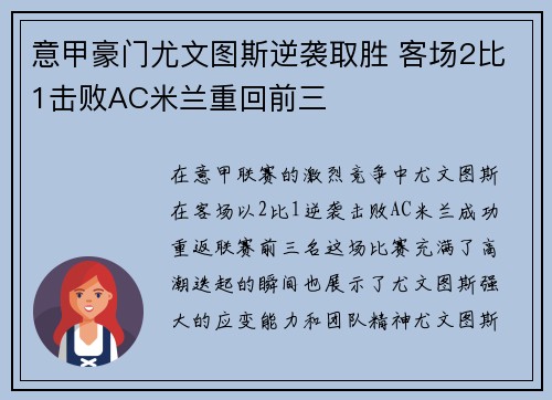 在意甲联赛的激烈竞争中,尤文图斯在客场以2比1逆袭击败AC米兰,成功重返联赛前三名。这场比赛充满了高潮迭起的瞬间,也展示了尤文图斯强大的应变能力和团队精神。尤文图斯的胜利不仅为他们积累了宝贵的三分,也让他们在与其他竞争对手的较量中占据了有利位置。本文将从四个方面对这场比赛进行详细分析:首先是尤文图斯在客场比赛中的战略布局与战术安排;接着是双方的球员表现,尤文图斯如何通过关键球员的发挥改变比赛局势;第三个方面是比赛的转折点与关键时刻的表现,尤其是尤文图斯如何逆转比赛的过程;最后,我们将探讨这场胜利对尤文图斯本赛季的影响,以及他们重返前三后的形势分析。通过这四个方面的分析,我们可以更全面地理解尤文图斯如何通过这一场重要胜利,扭转战局,站稳脚跟。