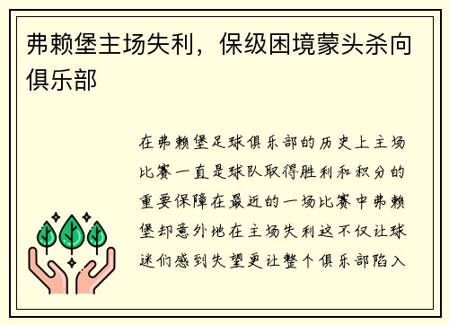 在弗赖堡足球俱乐部的历史上,主场比赛一直是球队取得胜利和积分的重要保障。在最近的一场比赛中,弗赖堡却意外地在主场失利,这不仅让球迷们感到失望,更让整个俱乐部陷入了深深的保级困境。随着赛季的深入,这一场失利可能成为压倒骆驼的最后一根稻草,让弗赖堡在保级的道路上愈加艰难。