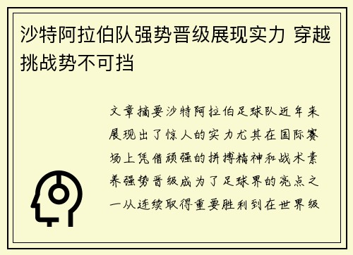 文章摘要:沙特阿拉伯足球队近年来展现出了惊人的实力,尤其在国际赛场上,凭借顽强的拼搏精神和战术素养,强势晋级成为了足球界的亮点之一。从连续取得重要胜利到在世界级赛事中屡次超越自我,沙特队无疑向世界展示了其足球实力的全面提升。本文将从四个方面对沙特阿拉伯队的强势晋级进行详细剖析:一是球队的战术创新和攻防平衡,二是球员的个人能力和集体协作,三是沙特足球的系统化发展与青训体系,四是沙特队面对挑战的坚定信念和勇气。通过这四个方面的探讨,我们可以更加深入地理解沙特队为什么能在激烈的国际竞争中脱颖而出,展现出不可忽视的势不可挡之势。